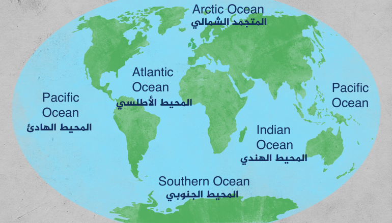 - التقسيم: هناك 5 محيطات رئيسية هي: المحيط الهادئ، المحيط الأطلسي، المحيط الهندي، المحيط الجنوبي، والمحيط الشمالي.