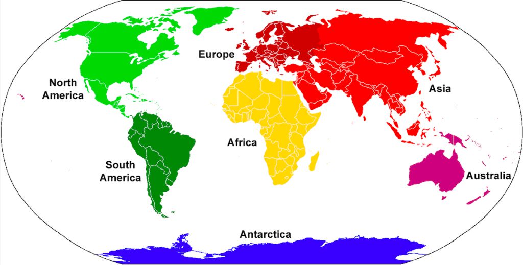 - التقسيم: يوجد 7 قارات رئيسية هي: آسيا، أفريقيا، أمريكا الشمالية، أمريكا الجنوبية، أوروبا، أستراليا، وأنتاركتيكا.