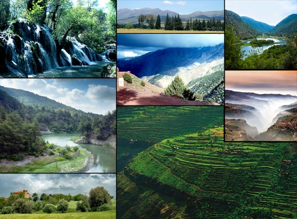 1. الجبال: تمتد الجبال على طول سلاسل طويلة وترتفع عن سطح الأرض. وهي تشكل ظاهرة جغرافية مهمة وتؤثر على مناخ المنطقة وتوزيع الأمطار وتشكل حواجز طبيعية.